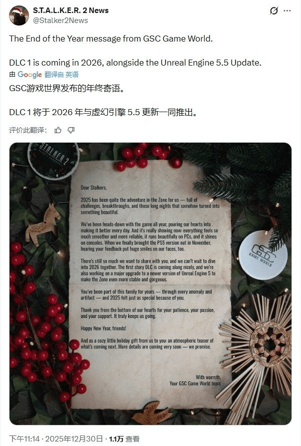 在同步发布的新年社区致辞中,GSC向玩家表示,首个故事DLC目前开发进展顺利。同时,团队正着手将游戏整体升级至更新版本的虚幻引擎5,以进一步提升“禁区”世界的稳定性与视觉表现,让环境细节与氛围更加震撼。