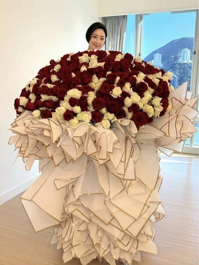 张玉珊在社交网晒出一束超巨型红白玫瑰花,花束足有张玉珊本人那么高。张玉珊站在玫瑰花后面,笑得十分甜蜜。